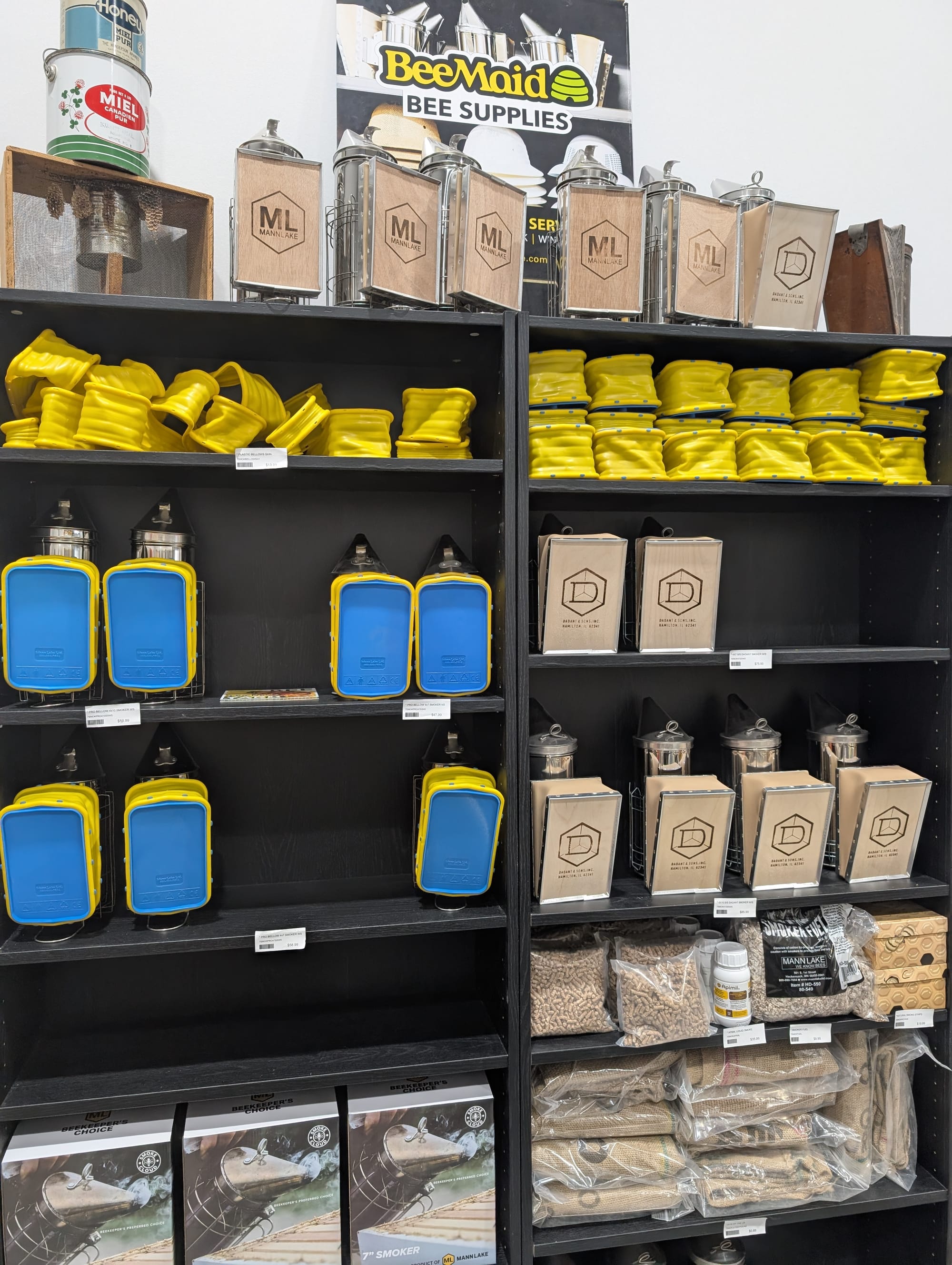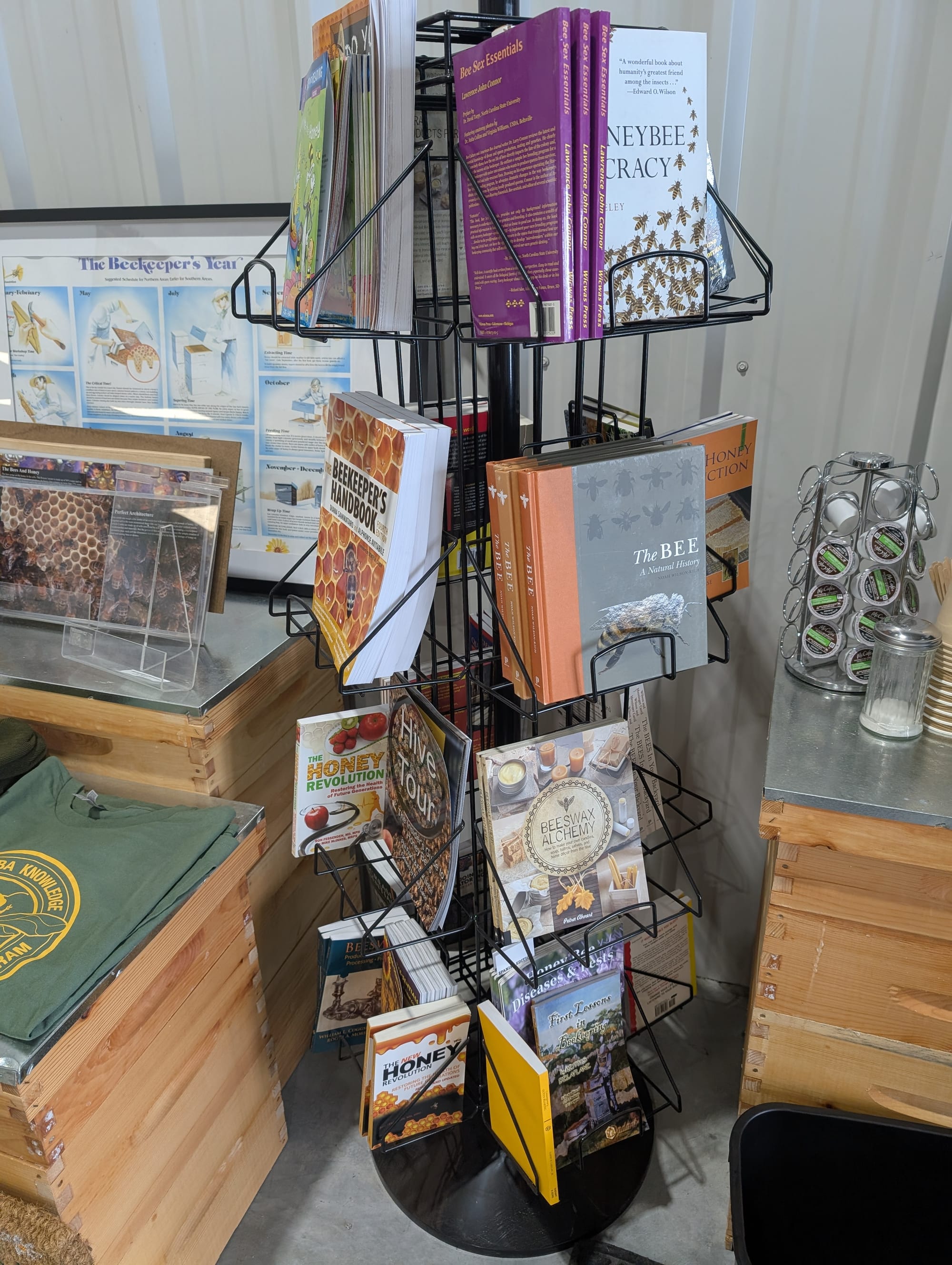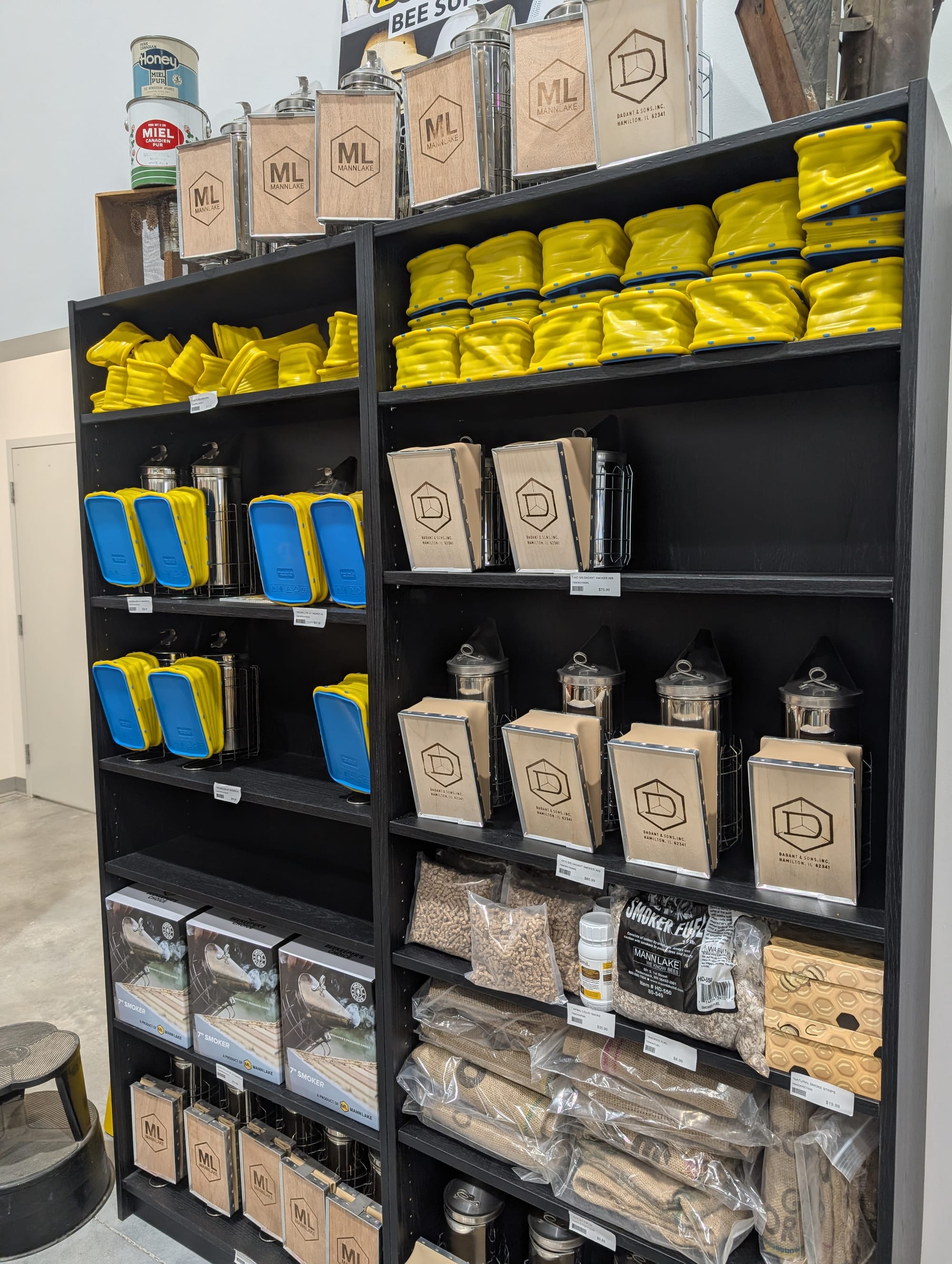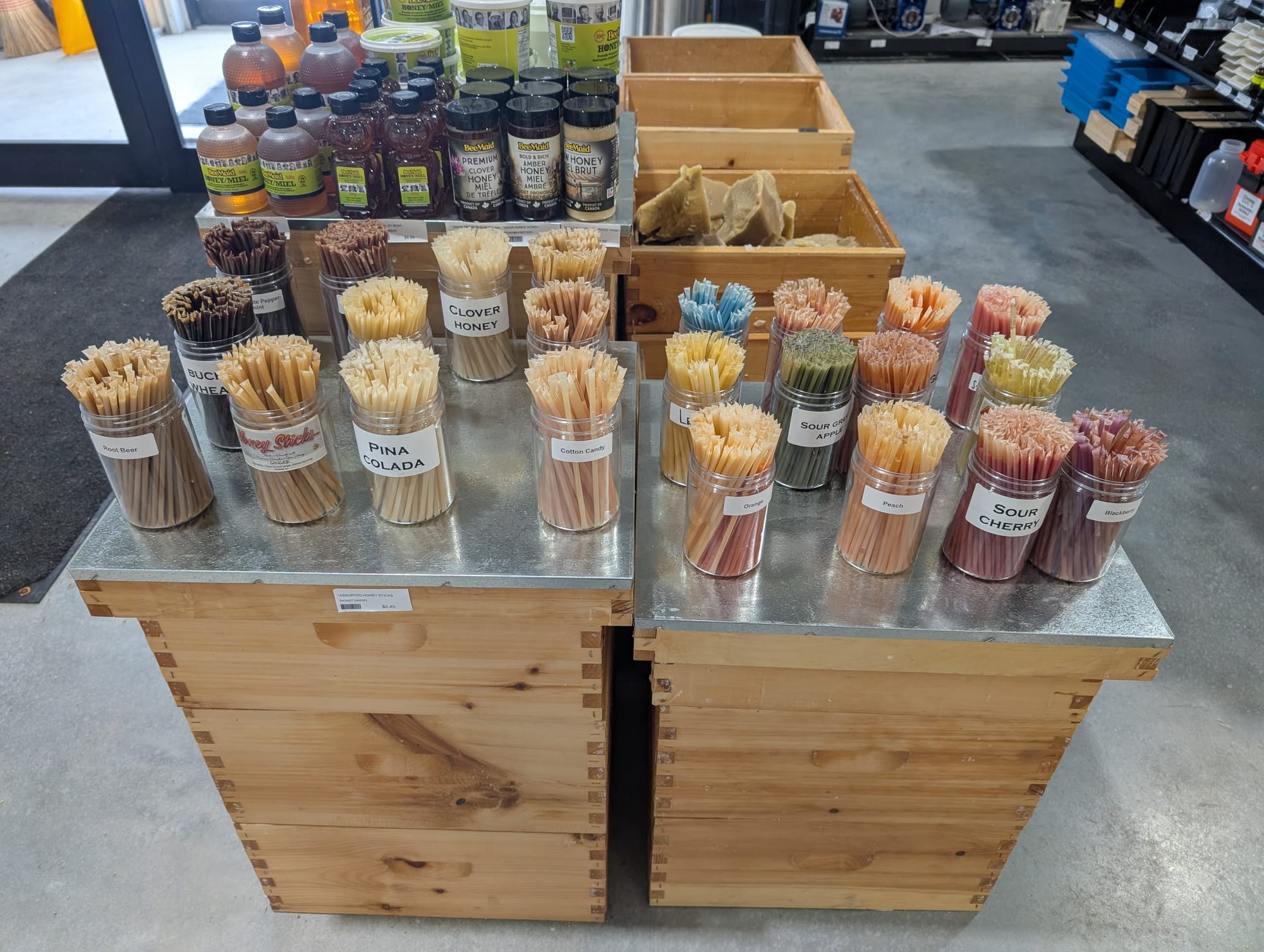 Huge selection of everything you would need to become a beekeeper, and then also lots of locally made bee items like candles, beeswax sheets, lip balm and flavored honey sticks etc.